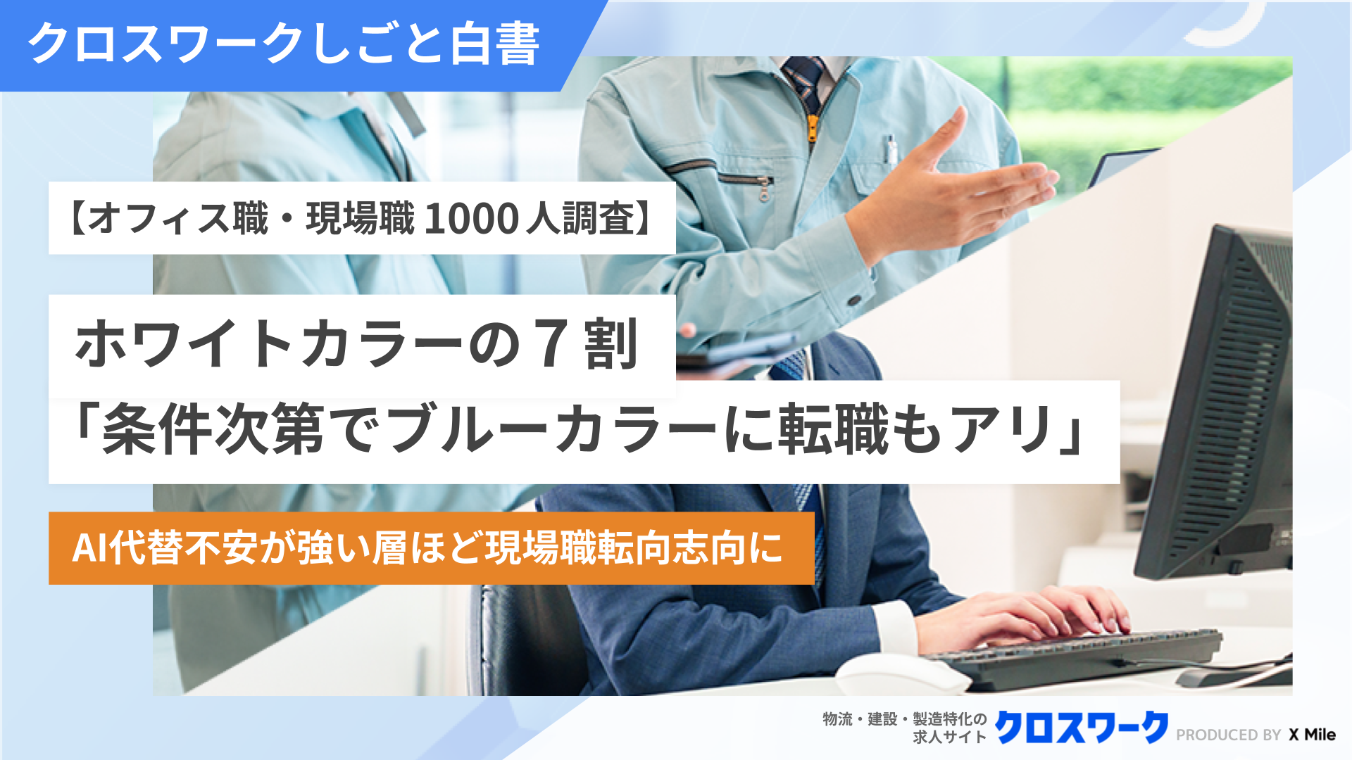 ※本記事は以下調査を参照しています。クロスワークしごと白書:https://x-work.jp/journal/driver-working_ai ノンデスク事業者向けの人材採用・キャリア支援サービス「クロスワーク」を運営する XMile株式会社は、全国の20〜60代ビジネスパーソン1,000名(オフィス職500名・現場職500名)を対象に「今後の働き方に関する調査」を実施した。 その結果、オフィス職(ホワイトカラー)の約7割が「条件次第で現場職(ブルーカラー)に転職してもよ...