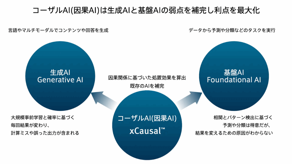 では、「コーザルAIアシスタント」は何が違うのか。最大の違いは「因果関係」を扱えることだ。生成AIが「パターンマッチング」で答えを出すのに対し、「コーザルAIアシスタント」は「なぜそうなるのか」という原因と結果の関係を理解する。